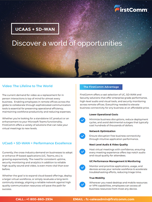 FirstComm offers a vast selection of UC, SD-WAN and Security solutions that offer expertise grade performance, high-level audio and visual tools, and security monitoring across remote offices.